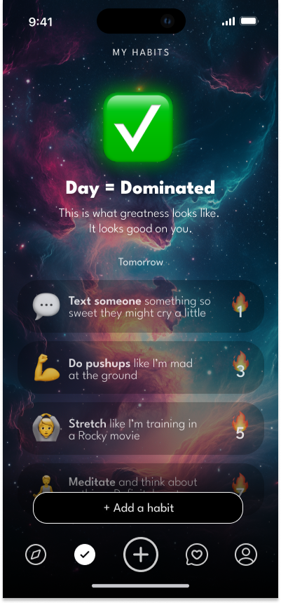 Achieving great things takes time. That’s where Quests come in.Each Quest is a week-long adventure built around a single theme like confidence, focus, or finally getting your life together before your plants file for neglect.Every day brings a new challenge that builds on the last, guiding you step by step through real growth.Each one helps you stay focused, inspired, and moving toward what truly matters.One week. One focus. One unstoppable you.